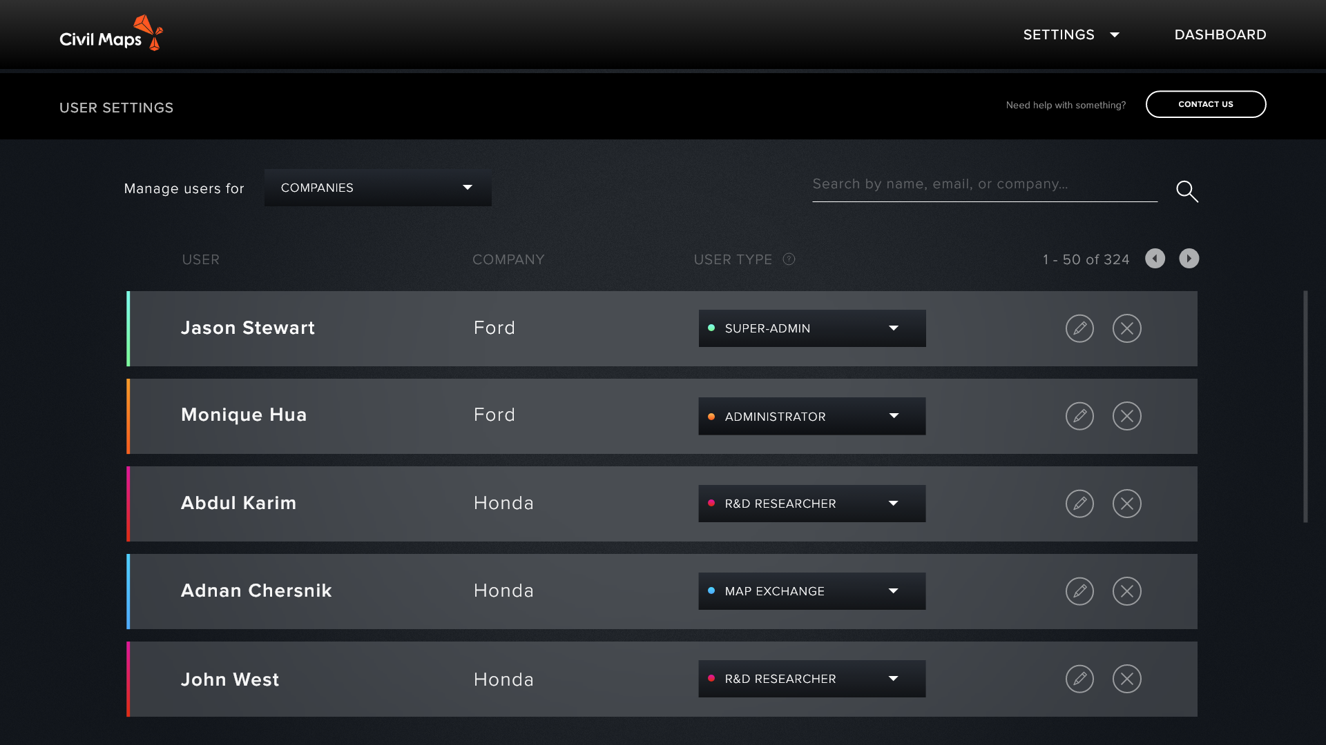 This screen’s primary function allows for Civil Maps to manage their user base, and organize them through various filters such as name, car company they work for and their user type.