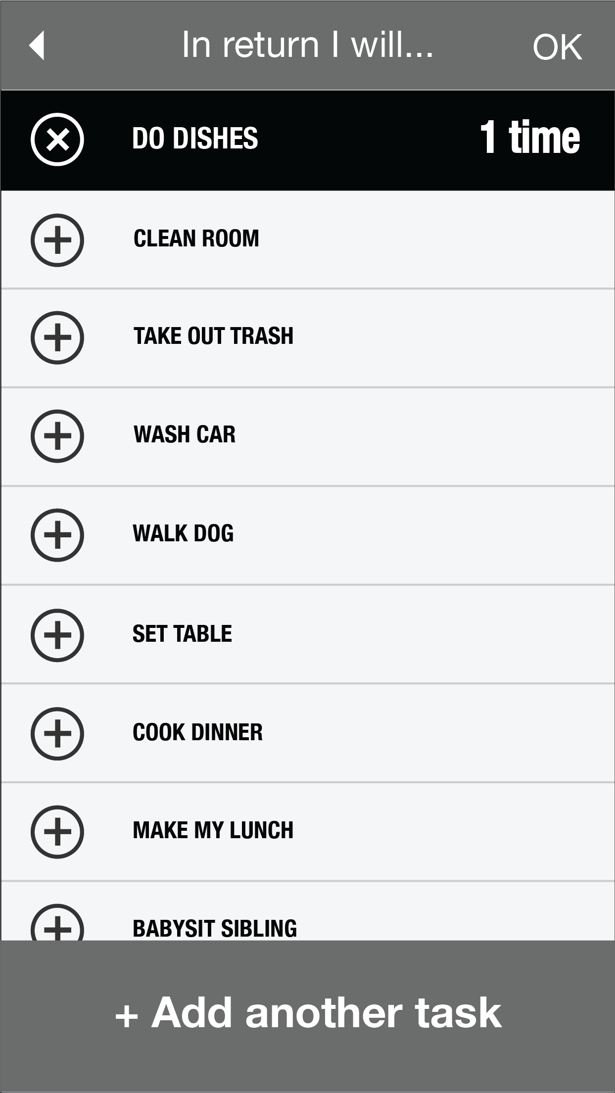 The final visual design really focused on providing an engaging UI for our young users. Buttons and text were made larger to be easily digestible, and the colors are bright and fun. Even though the users are doing boring chores, the visual design emphasizes a playful atmosphere that gives the users a feeling of playing a game rather than work.