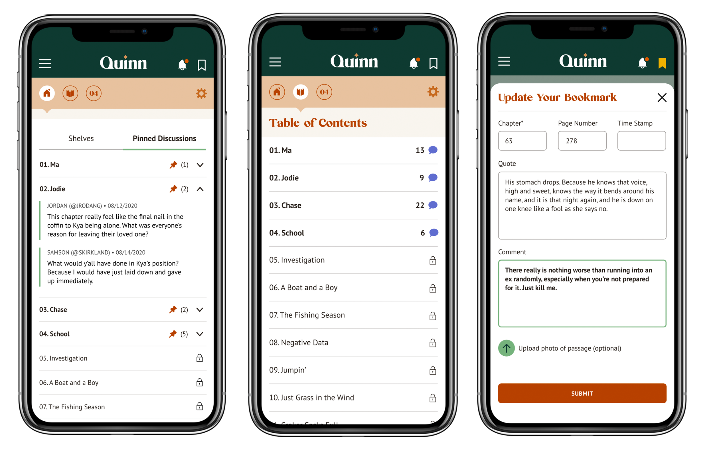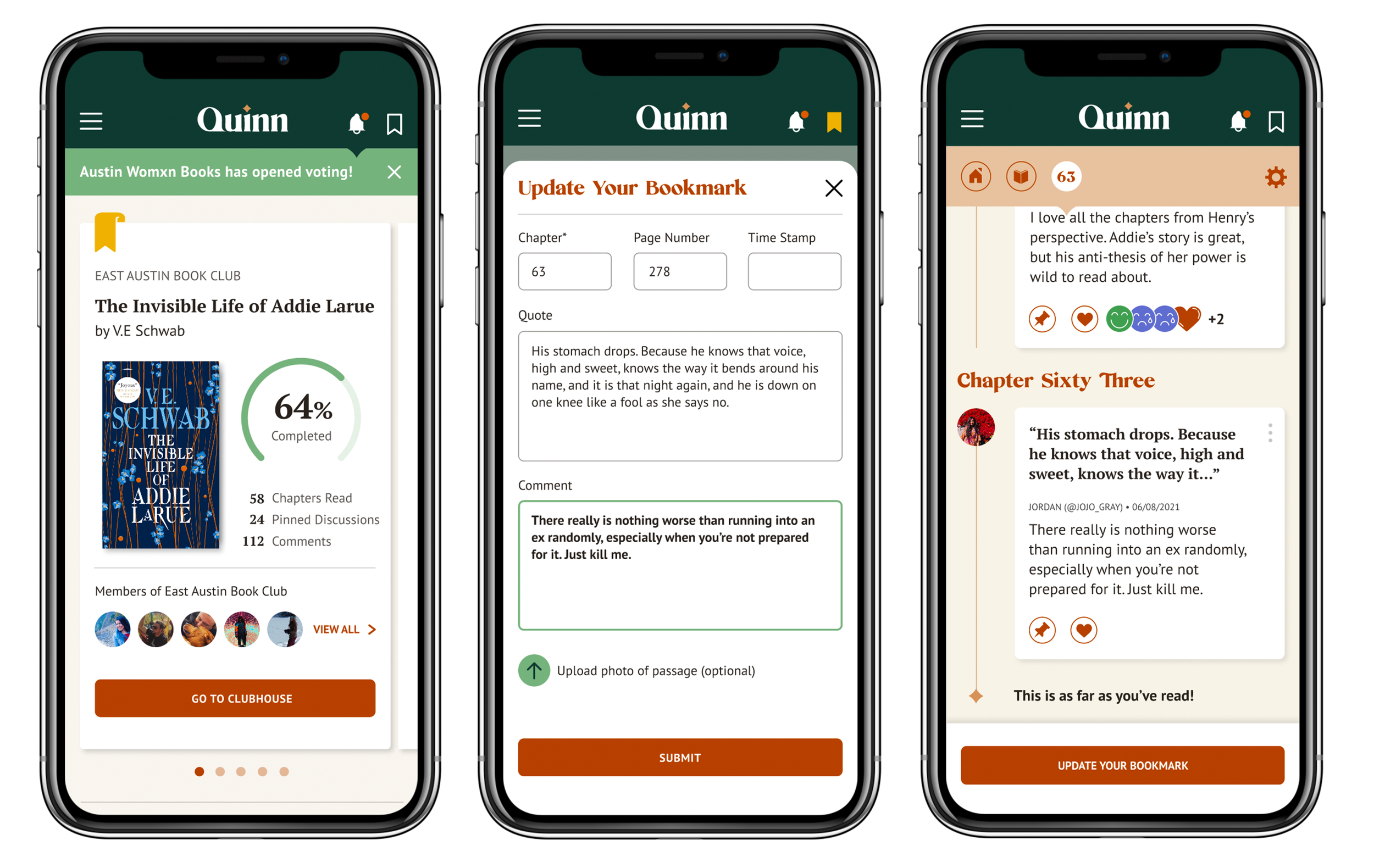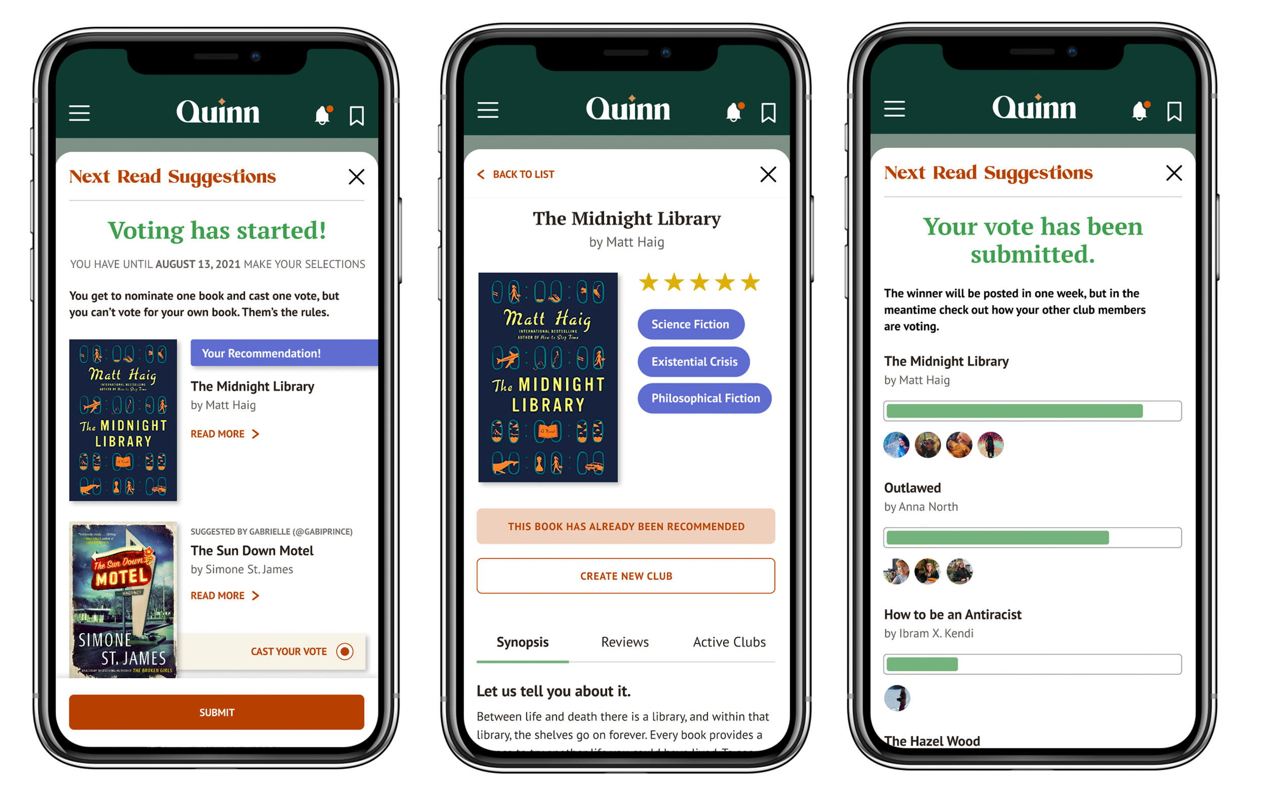 Quinn is a platform designed for book clubs, creating a dedicated space for deeper discussion, flexible reading, and shared progress. It rethinks how groups read together, supporting different paces while making it easier to engage, participate, and stay connected between meetings.